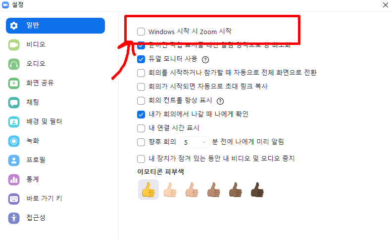 우측 상단 "windows 시작 시 zoom 시작" 체크 해제