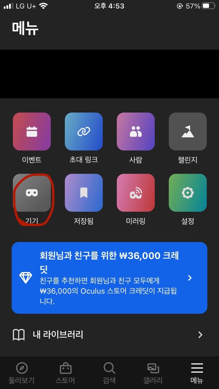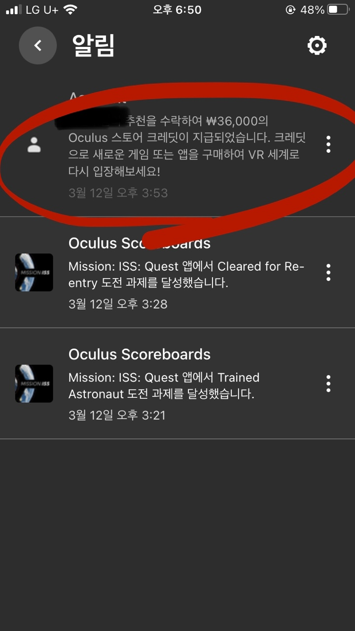 Oculus 앱을 실행하여 36,000 크레딧 지급 알림을 확인