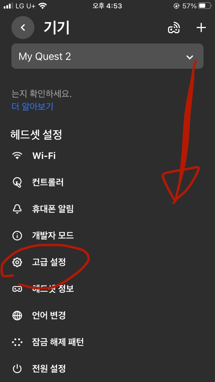 4. 아래로 스크롤하여 '고급 설정' 진입 ( 오큘러스 퀘스트 2 기기의 전원 작동 필요 )
