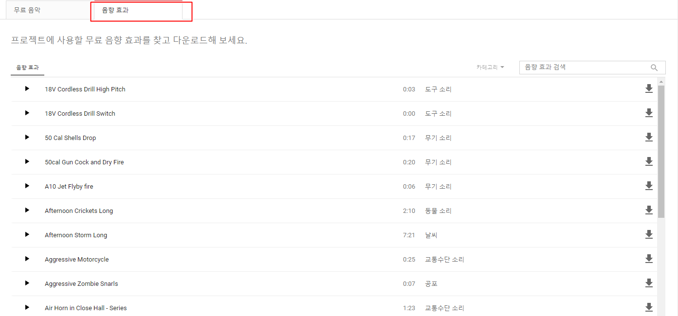 음향 효과 탭으로 이동하면 음악 뿐만 아니라 효과음, 앰비언스, 배경음 등등을 다운로드 받을 수 있다